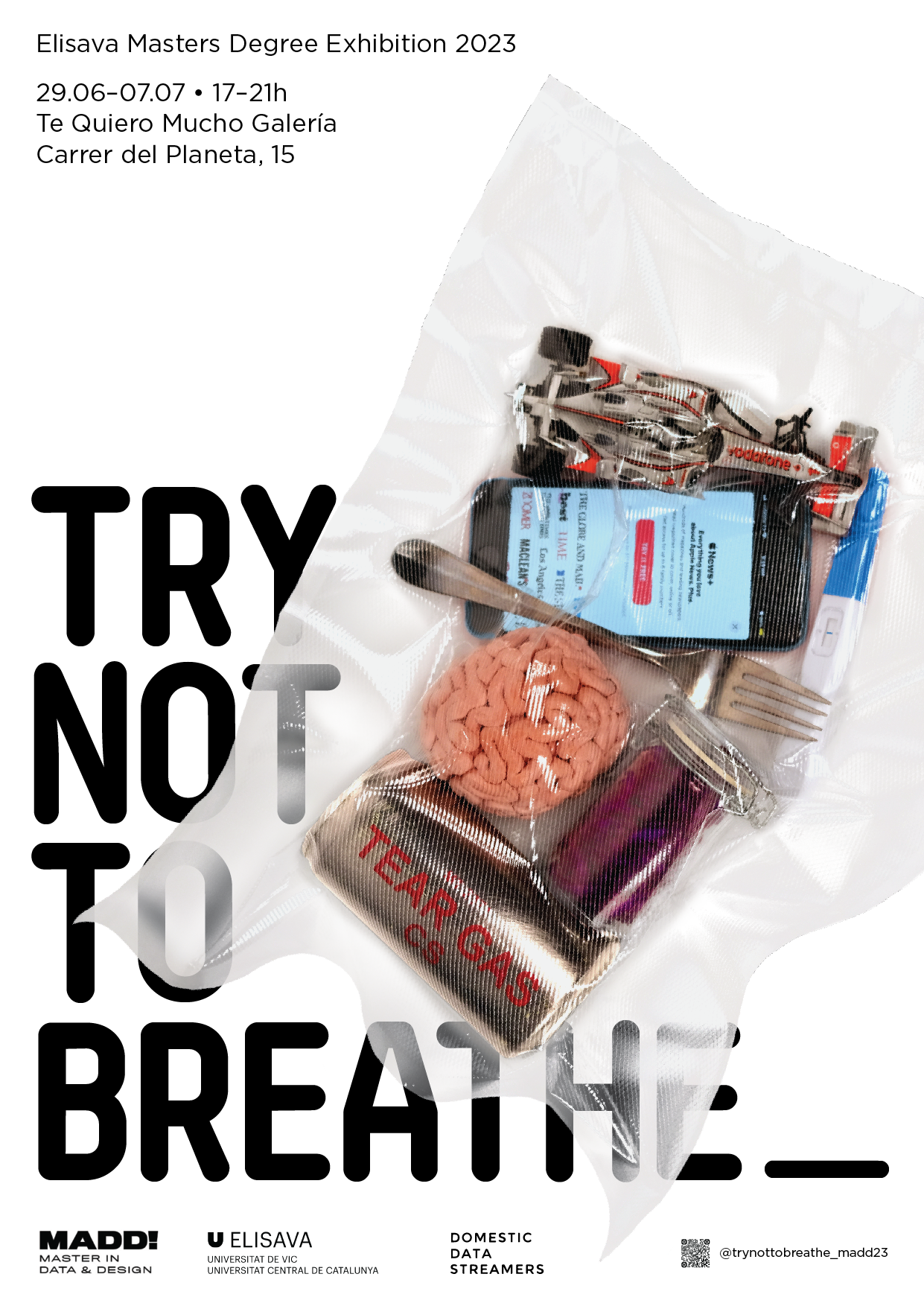 Del 29 de junio al 7 de julio tendrá lugar “Try Not to Breathe”, donde se expondrán los trabajos finales de los estudiantes de Máster en Data Design (MADD) en colaboración con Domestic Data Streamers. Los proyectos expuestos estarán en la galería Te Quiero Mucho, que abrirá sus puertas el jueves 29 a las 17h y se podrá visitar entre las 17h y las 21h.