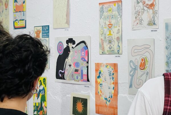 Nuestras paredes reciben el increíble trabajo de Sonja Ben y R. Rotx. Una mezcla entre el cómic tradicional, el manga y el street art que utiliza los colores vivos para contar historias un tanto incomodas. Lxs artistas son profesionales del mural y han pintado en diferentes países de Europa llevando sus extrañas historias a públicos de todo tipo. En Te Quiero Mucho nos dejan un enfrentamiento armado, una escena psicopata y divertida que además esta plasmada en una risografía a 5 colores editada especialmente para nosotrxs.